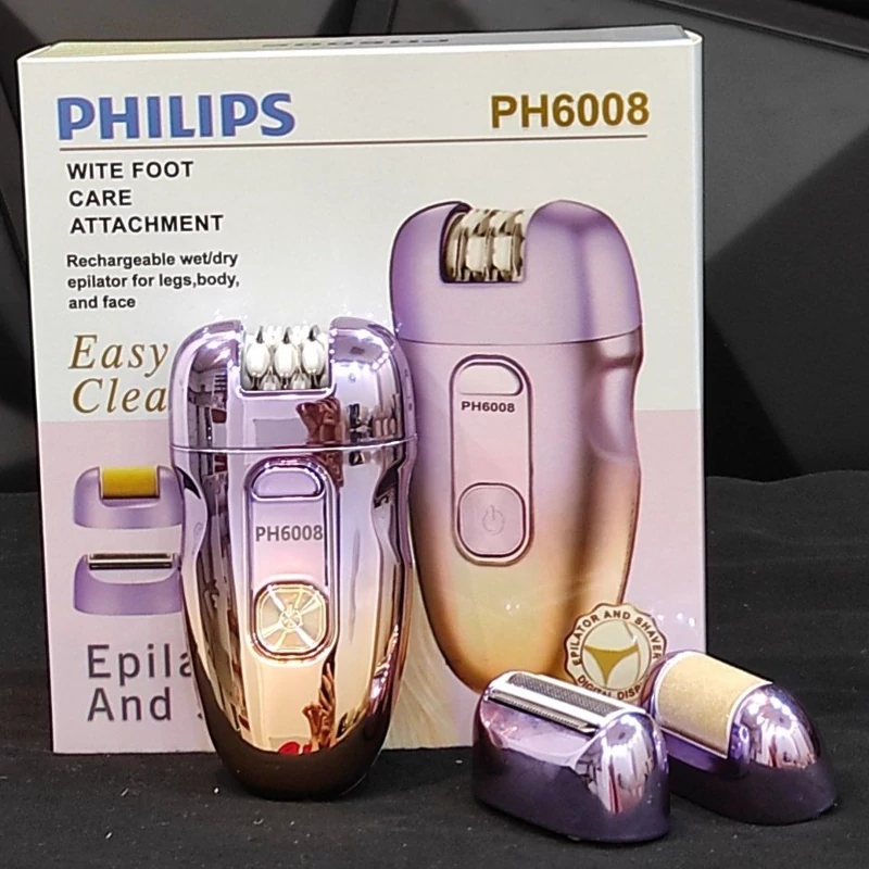 اپیلاتور و شیور 3 کاره فیلیپس مدل PH6008 کارایی دستگاه 3 کاره (اپیلاتور، شیور، سنگ پا)بسیار شیک و کادویی